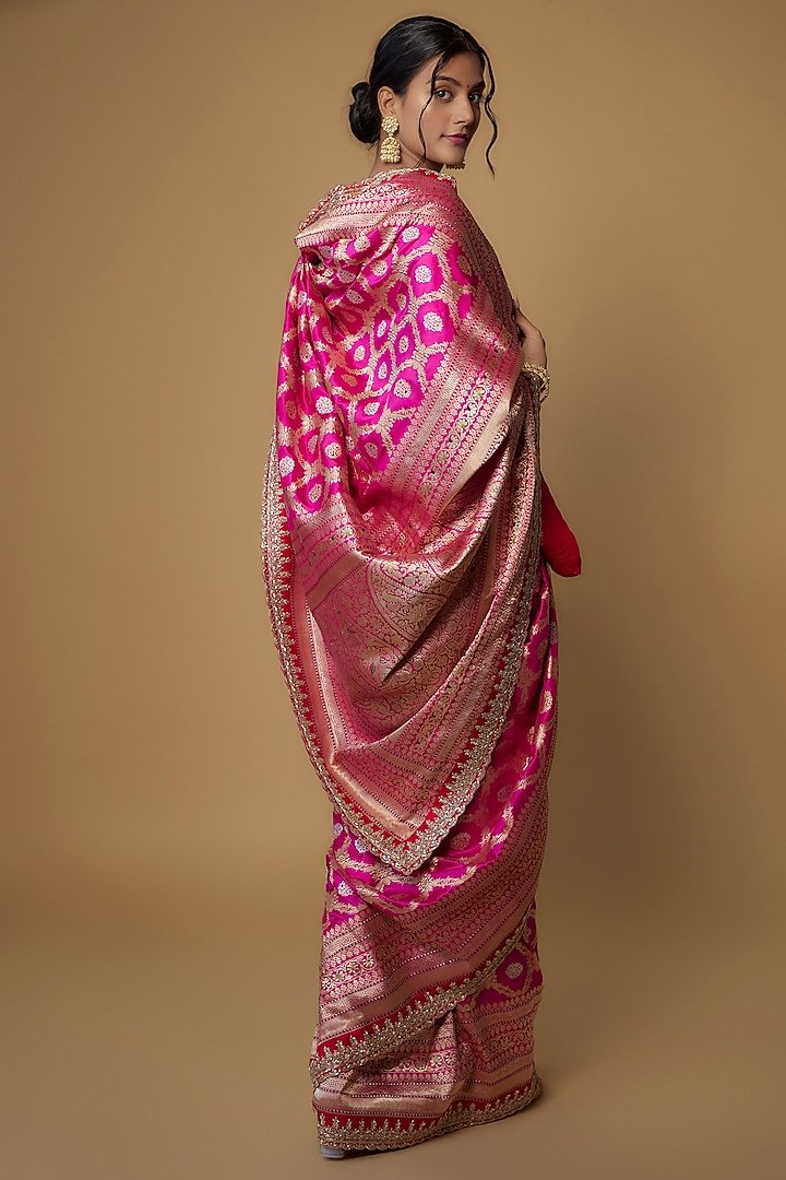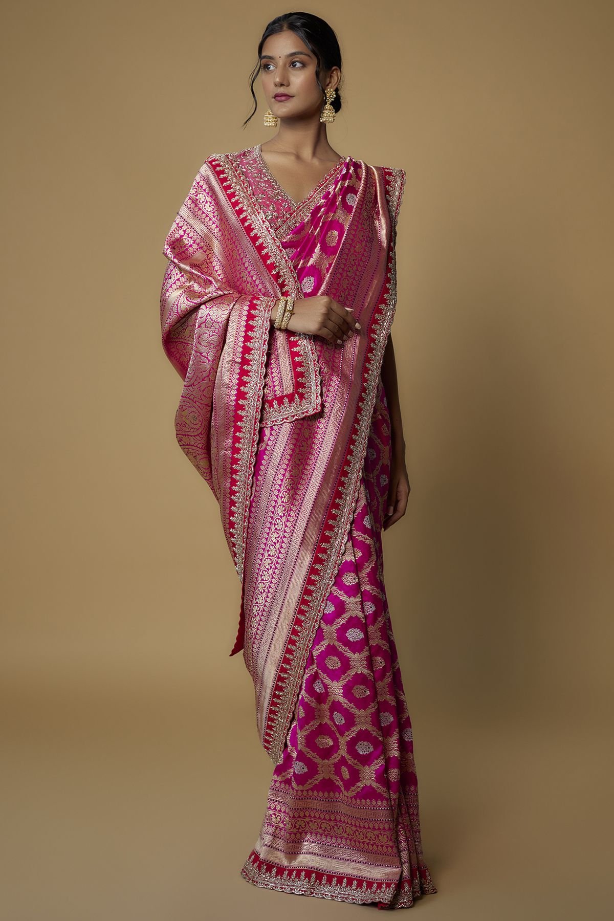 Featuring a pink saree in silk banarasi base with zardosi border. It is paired with an unstitched blouse.